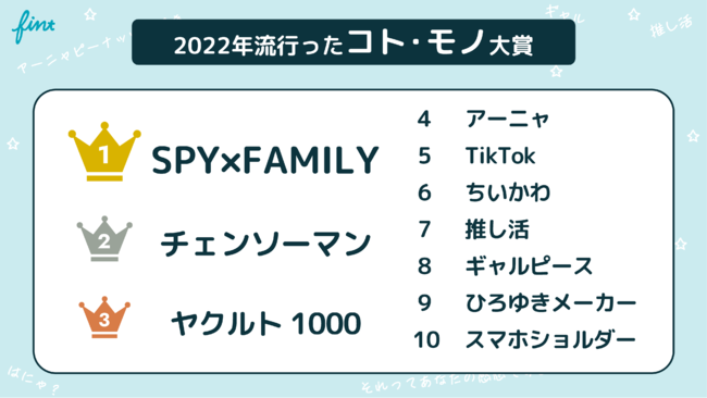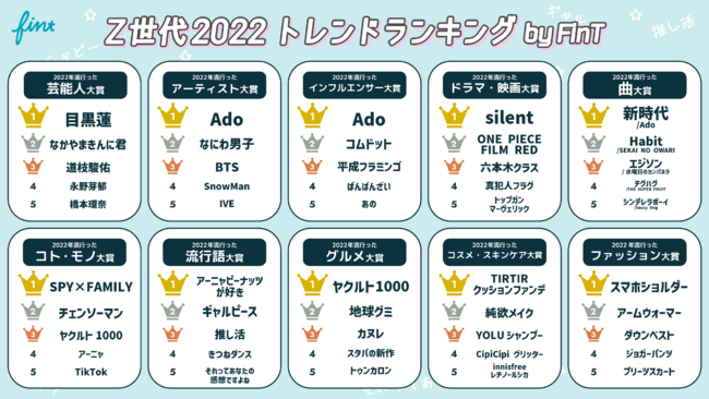 株式会社FinT(本社:東京都目黒区、代表取締役:大槻祐依)は、Z世代602名を対象に調査した結果をもとに、2022年のZ世代トレンドランキングを各部門ごとに発表します。