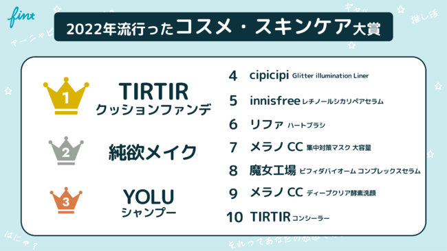 ガルクラ(ガールクラッシュと呼ばれる、同性人気の高い女性KPOPアイドルの総称)に影響を受けた濃いめポイントメイクが流行に。ギャルブームとも相まって束間のあるつけまつ毛や、ポイントにこだわる純欲メイクなどもトレンドになりました。コスメやスキンケアは自分の素材を活かし、自分に合ったものを選択するパーソナライズ化が進んでいます。