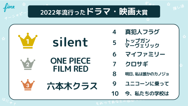 Z世代の間では、心が洗われる“感動”や、考察から見える伏線の“感動”など、さまざまな“感動”を共有する動きが強くなっています。SNS上でそれぞれの考察をリアルタイムで共有しながらドラマを見る人が増えていることも特徴です。話題を集めたドラマ・映画がランクインしました。