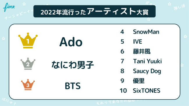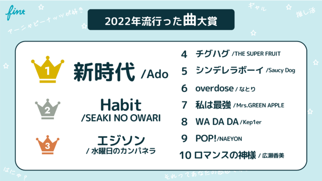 人気アイドルグループだけでなく、TikTok上で音源が流行した新人アーティストもランクイン!楽曲の人気はもちろん、アーティストのポーズやファッションを真似するZ世代も増加しています。