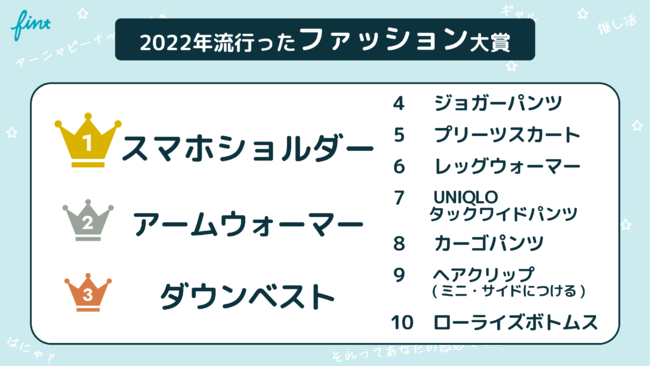片手を塞がずにスマホを使用できるとして、便利さとオシャレさからスマホショルダーを持つZ世代が急増しました。2022年はスポーツMIXファッションも流行っており、頑張りすぎずにオシャレしたい、オシャレに楽を求める動きが強かったのも印象的です。
