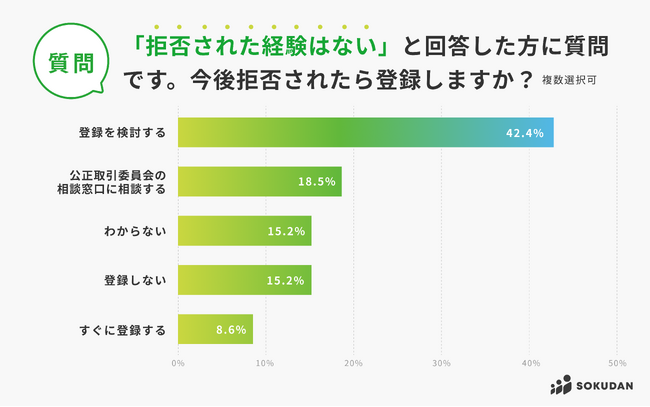 42.4%が「登録を検討する」、8.6%が「すぐに登録をする」と、合わせて半数以上が登録を検討したり、登録をする方向で考えている結果となりました。しかし、「公正取引委員会の相談窓口に相談する」18.5%や「登録しない」15.2%を合わせると、登録しない方針を維持する方も33.7%と3人に1人はいるという結果となりました。