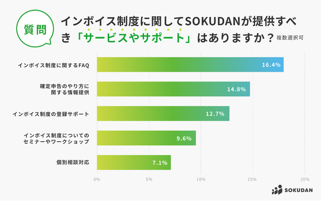 SOKUDANに提供してほしいサービス・サポートについては、「インボイス制度に関するFAQ」「確定申告のやり方に関する情報提供」が上位となりました。制度開始直後のため、基本的な内容に関するサポートが求められる傾向にあることが考えられます。