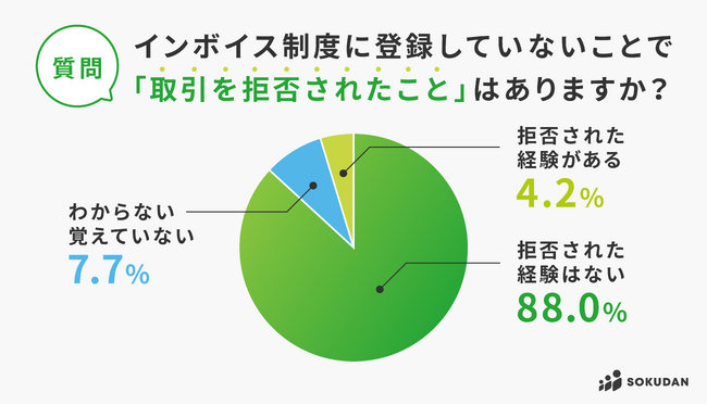 登録していないことによる取引の拒否経験は少数に留まっていることが分かります。しかし、拒否されたという回答が4.2%と全くないわけではなく、今後のビジネスにおいて不安要素となる可能性があります。登録していない事業者に対する市場の反応や取引先の態度には引き続き注意が必要です。