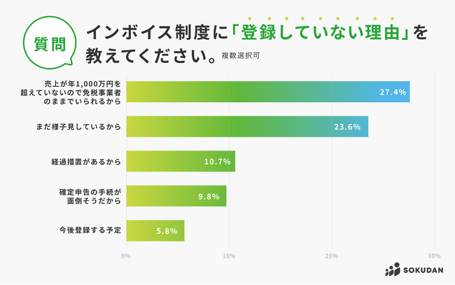 最多の「免税事業者のままでいられるから」27%と、3位「経過措置があるから」が10.7%であることから、免税事業者としての地位を継続するためという理由が多い結果となりました。一方、「まだ様子見をしているから」が23.6%いることにも注目です。