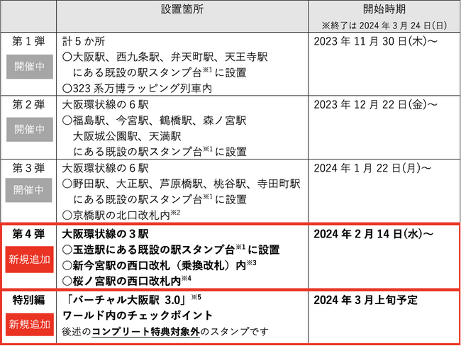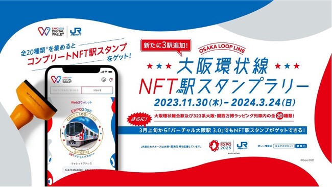「EXPO 2025 デジタルウォレット」にて「大阪環状線NFT駅スタンプラリー」を2023年11月30日(木)より実施していますが、2024年2月14日(水)より第4弾を開始し、新たに3駅のNFT駅スタンプを追加し、スタンプラリー対象の全20箇所が出揃います。これにより、対象箇所を全て集めた方に配布される特典「コンプリートNFT駅スタンプ」が獲得できるようになるほか、さらに追加特典として、特別な賞品を先着順でプレゼント※1する企画を予定しています。