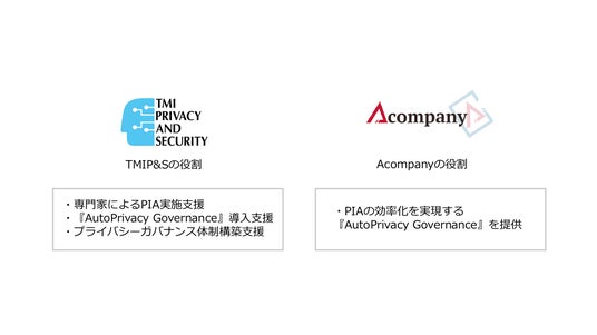 プライバシーDXを推進する株式会社Acompany(アカンパニー、愛知県名古屋市、代表取締役CEO:高橋 亮祐、以下 Acompany)とTMI総合法律事務所が設立したTMIプライバシー&セキュリティコンサルティング株式会社(東京都港区、代表取締役:大井哲也、以下 TMIP&S)は、プライバシー影響評価(以下 PIA)を通して企業のプライバシーガバナンス強化に貢献すべく、協業を開始いたします。