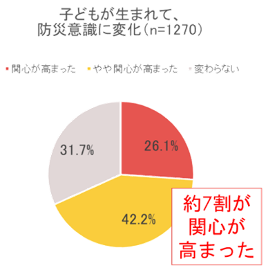 子育て世帯を対象に実施した「防災に関するアンケート調査」※2によると、約7割(68.3%)が、「子どもが生まれたことで防災への関心が高まった」と回答している一方で、7割超(72.1%)が「子どもの防災用品は準備していない」という結果に。「何を準備すればいいのか分からない」、「時間がない」などが理由として挙がっています。