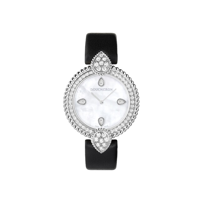 ブラックのカーフレザー製ストラップとマザーオブパールの文字盤のコントラストが印象的なウォッチは、ダイヤルに配されたダイヤモンドがアクセントになり、クラシックでありながらモダンな表情をもたすタイムピースに仕上げられています。同コレクションのジュエリーともコーディネートすることで、上品で洗練されたスタイルを演出します。過去から現在に至るまで継承されるセルパンボエム コレクションのコードを連想させると同時に、身に着ける人の個性を引き立て、新たな季節に大切な時を刻みます。