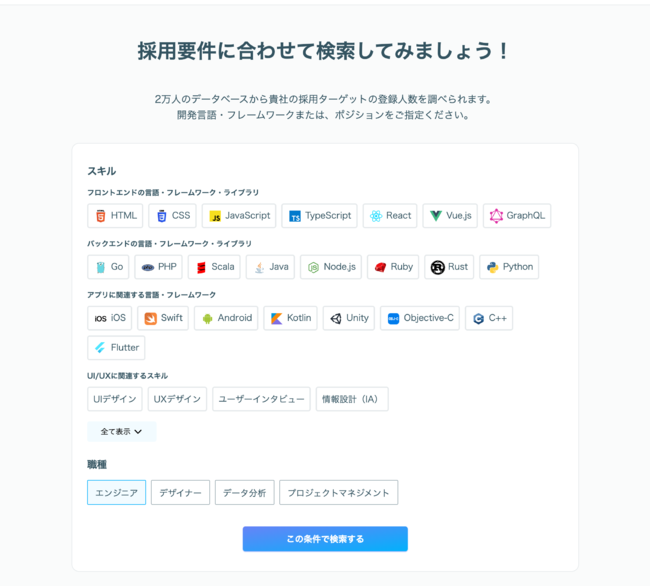 Offers未利用者でも自社の採用要件にマッチするOffers登録者数や、Offersを活用した場合における採用スケジュールの目安を把握することができます。また、エンジニア・デザイナーといった職種や言語、フレームワーク、ライブラリなど、細かい条件で絞り込みが可能です。