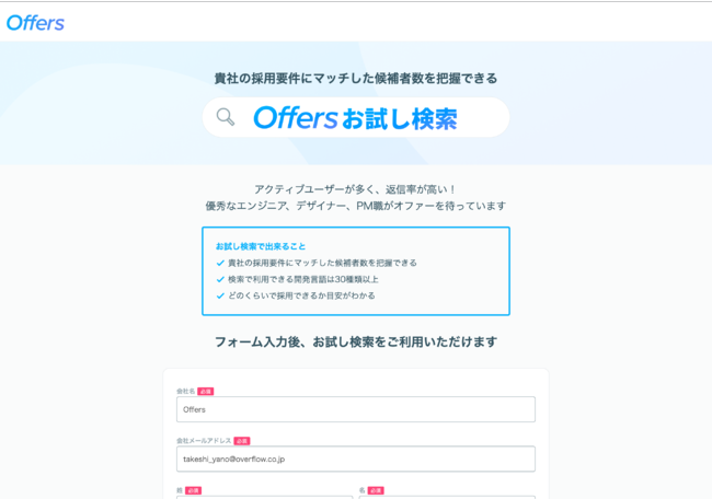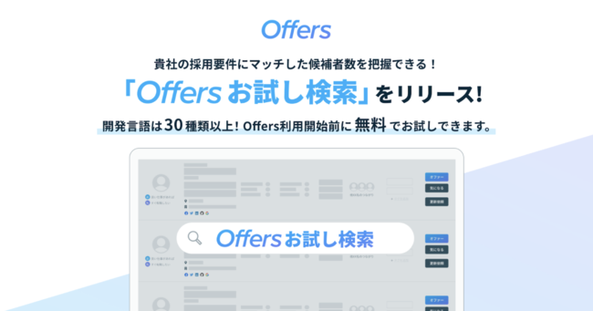 「Offersお試し検索」とは、ITエンジニア/デザイナーを採用したい企業担当者が、採用要件を入力するだけで、要件にマッチするOffers登録者数が一目で分かる機能です。