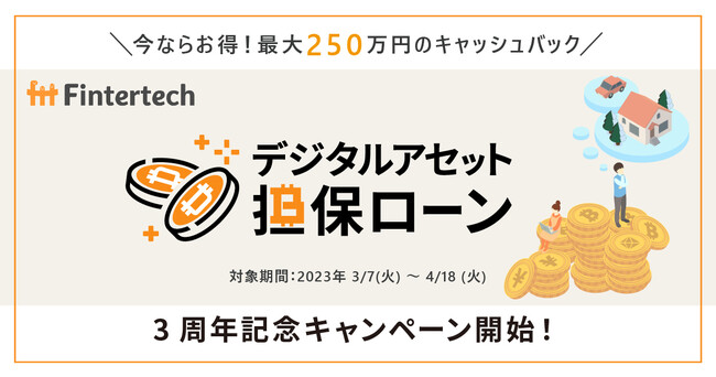 最先端テクノロジーを活用し次世代金融サービスを創出するFintertech株式会社(本社:東京都千代田区、代表取締役社長:武田 誠、以下「Fintertech」)が提供する「デジタルアセット担保ローン」は、2023年3月でサービス開始から3周年を迎えます。3周年を記念して新規お借入れいただいたお客様に最大250万円がキャッシュバックされるキャンペーンを開催します。※諸条件あり