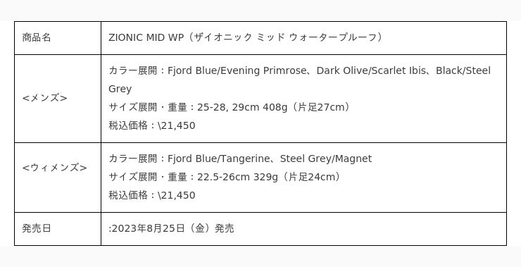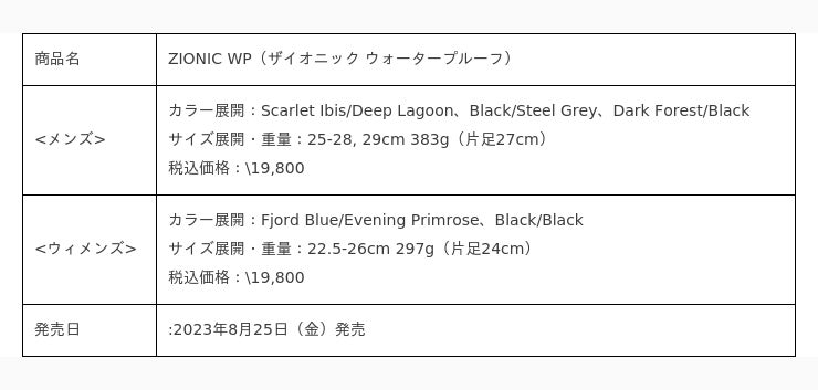 NEW <メンズ・ウィメンズ展開> ZIONIC WP (ザイオニック ウォータープルーフ) 8/25発売