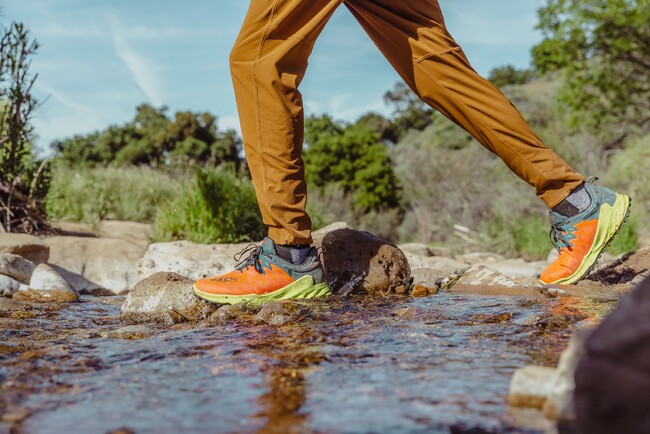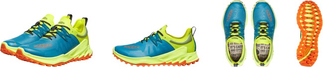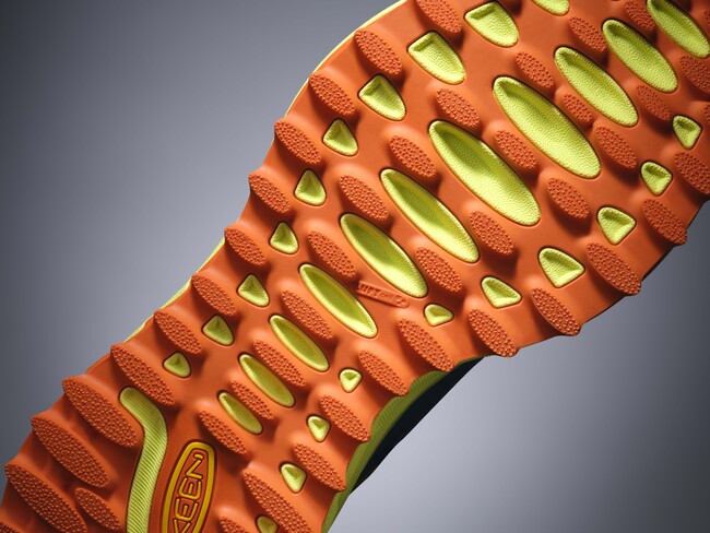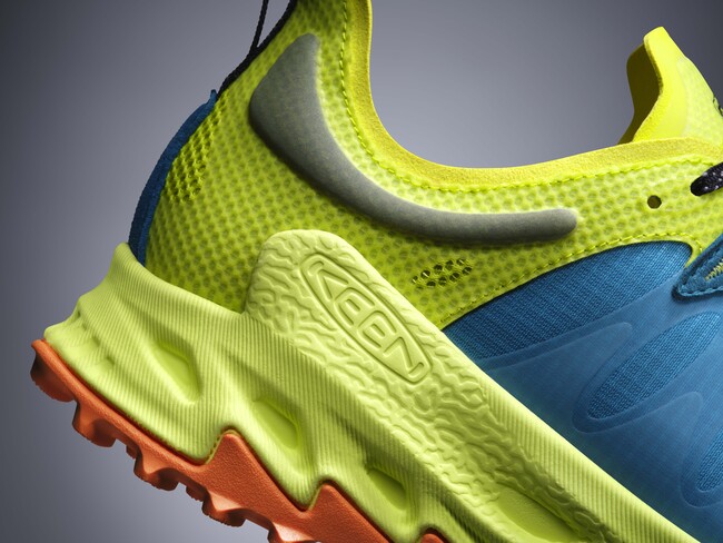 KEENのハイクシューズの特徴でもある、つま先にゆとりを持たせたトゥボックス構造はキープしながら、より流線形なデザインにすることで、足に密着するような適正なフィット感を生み出し、素早い動きにも対応するサポート性を向上。再生リップストップ素材のアッパーはフッ素化合物(PFAS)不使用の撥水加工を施しています。そして、トレイルの過酷な環境にも耐えられるようにTPU製のオーバーレイで耐久性を強化。補強にTPUを使うことは、シューズの軽量化にもつながっています。そして、軽量のEVAミッドソールとフルレングスのスタビリティプレートを採用した新設計ソールシステムが、エネルギーを効率的に推進力にするスプリングボード効果を生み出します。