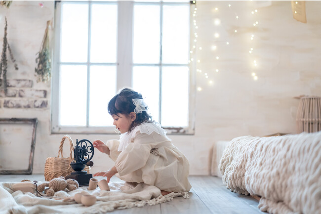完全プライベートの空間を2時間使用でき、リラックスした雰囲気の中でお子様の自然な姿を撮影できます。ヘアメイクはもちろん、インテリアや一部衣装もコフレオリジナル。毎年撮影に訪れる根強いファンも。東名阪を中心に全23店舗展開。