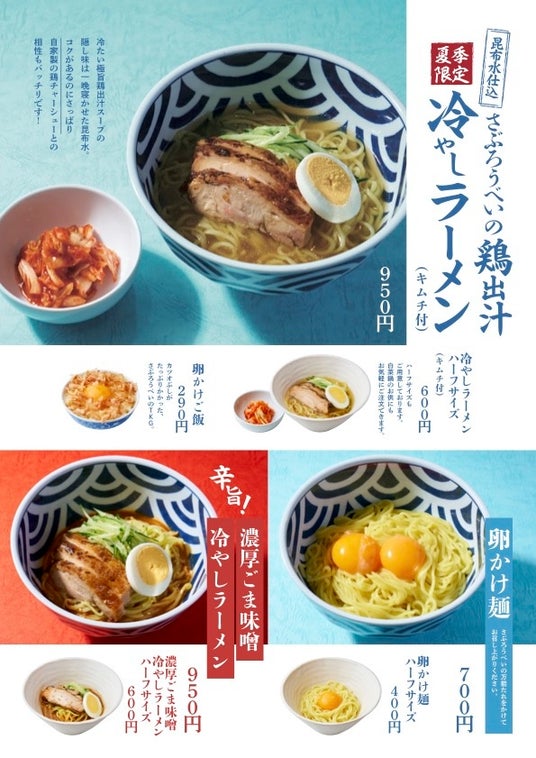 毎年大人気の「冷やしラーメン」に加え、新たに「卵かけ麺」、「濃厚ごま味噌冷やしラーメン」が新登場。