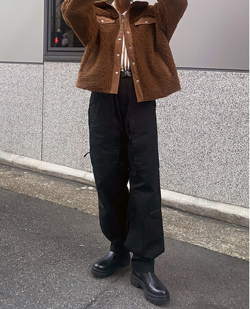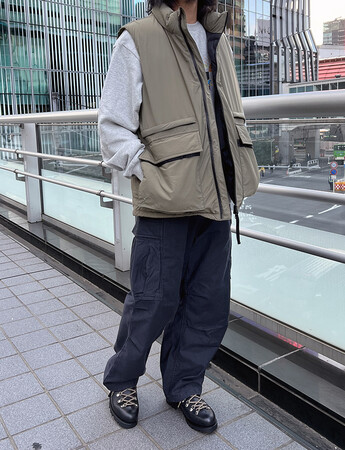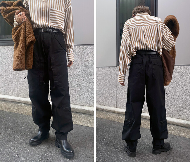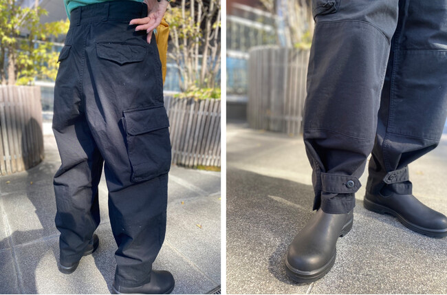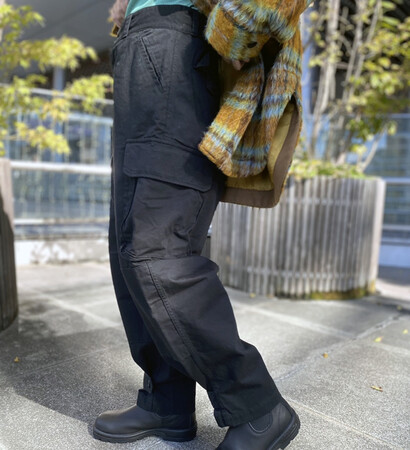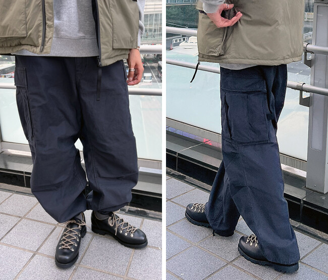 デザインモチーフとなったコンバットトラウザーはミリタリーパンツでありながら、アシンメトリーなデザイン、散りばめられたディテールといった生産に手間のかかるミリタリーパンツ。ボタン止めのベルトループ、カーゴポケット、そして傾斜をつけることで使い勝手の良さを追求したバックポケットといったディテールを国内生産により忠実に再現。その他にも厚地織物の産地でもある岡山県井原市の工場で高密度に織り上げられた生地はハリがありながらも柔らかな肌触りに。さらに国内の加工工場で丁寧に時間をかけて染め上げることで、コットン本来の膨らみ感を感じさせてくれます。ゆったりとした穿き心地ながら、足元のもたつきが少なく綺麗に穿きこなして頂けます。
