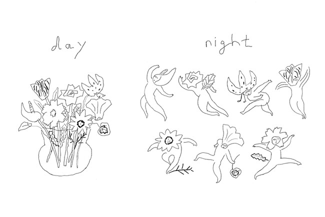 生活の中で日常的に使う器に、ドラマチックな要素を忍ばせたくて 昼の間は花瓶に生けられているお花達が、 人が寝静まった真夜中にダンスしているという 2コマの展開を想定して描きました。