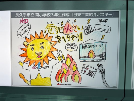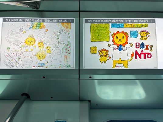 日東工業は毎年、愛知県長久手市内の小学校3年生を対象に工場見学を実施しています。今回ラッピング車両内の車内照明広告に、2024年度工場見学に参加した児童が描いた「日東工業の紹介ポスター」を掲示しましたので、是非ご覧ください。