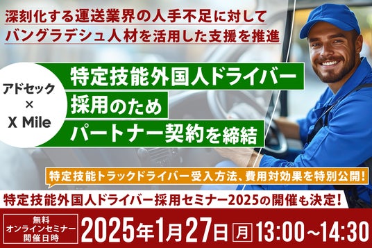 本協業を通じて、アドセックとX Mileは、お互いのノウハウを組み合わせ、深刻化するトラック・バス・タクシーのドライバー不足解消に向けて、国内の運送企業の皆様が特定技能外国人を雇用するための仕組みづくりをサポートしていきます。