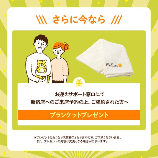 2. お迎えサポート窓口にて Pʼs-first 新宿店へ来店予約の上ご成約された方へ、 Pʼs-firstロゴ入りブランケットをプレゼント