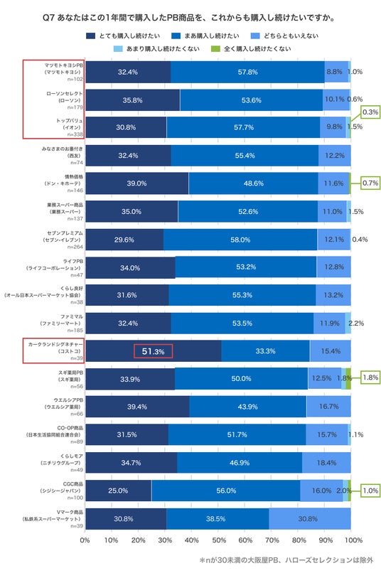 「とても購入し続けたい」に着目すると、「カークランドシグネチャー(コストコ)」(51.3%)の高さが目立ちます。