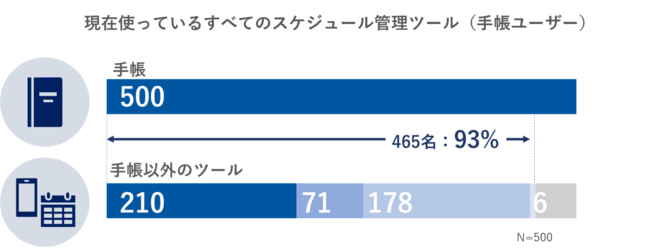 手帳をメインに使うユーザーのうち、スマートフォンアプリやPCツールなど、その他のスケジュール管理ツールも併用している人は93%という結果に。