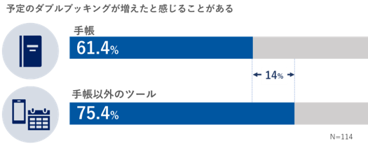 時間の使い方でトラブルを感じている人へ、コロナ禍前後を比べて「予定のダブルブッキングが増えたか」を聞くと、手帳ユーザーは61.4%、その他ユーザーは75.4%で手帳ユーザーが14%少ない結果に。テレワークでデジタル上でのやり取りが増えたことにより「予定を詰め込まれる」などの弊害が生まれている中、手帳ユーザーは他ユーザーに比べトラブルを回避できていることがわかります。
