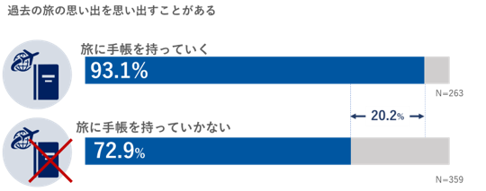 「過去の旅を思い出すことがあるか」の質問では、旅に手帳を持っていかない人の72.9 %が「あてはまる・どちらかといえばあてはまる」と答えたのに対して、持っていく人では同様に答えた人は93.1%。その差は20.2%になり、旅に手帳を持っていくことで、振り返りの機会が多くなることがわかります。
