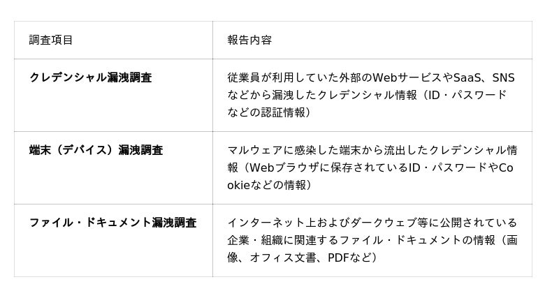 本調査項目では、インターネット上およびダークウェブ等を含む外部情報源を対象に、企業・組織に関連する認証情報や機密情報の漏洩有無を調査します。