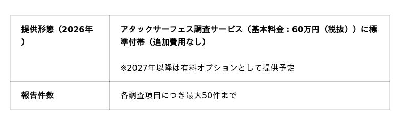 情報漏洩リスクに対するニーズの把握および活用促進を目的として、2026年12月31日まではアタックサーフェス調査サービスに標準付帯(追加費用なし)で提供します。なお、2027年以降については、有料オプションとしての提供を予定しており、提供形態は市場ニーズを踏まえて最終決定します。