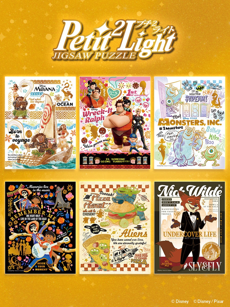完成したパズルは、プチ2専用インテリアスタンドフレーム(別売)を使ってそのままデスクや棚に飾れます。モアナと伝説の海、シュガー・ラッシュ、モンスターズ・インク、リメンバー・ミー、エイリアン、ニックの6種を揃えて、あなただけの世界をお楽しみください。