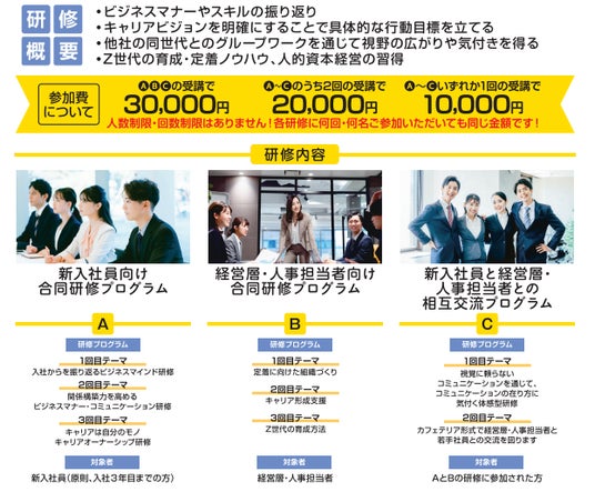 この度、市内企業の人材育成にかかる負担を軽減するため、新入社員、企業の経営層・人事担当者向けにそれぞれ合同研修会を開催することとなりました。