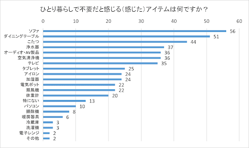 「ひとり暮らしで不要だと感じる(感じた)アイテムは何ですか?」という質問では、「ソファ」が56票を集め、続いて「ダイニングテーブル」が51票、「こたつ」が44票という結果でした。