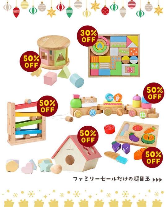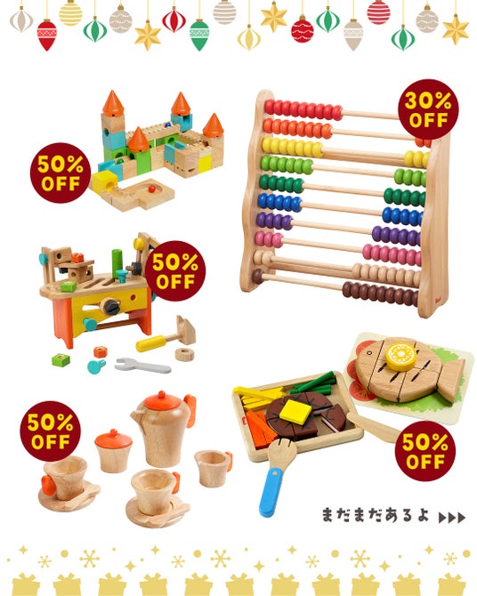 0歳から3歳向けの木のおもちゃや、木のおもちゃをはじめとするベビーグッズを、2日間限りの特別価格でご提供いたします。