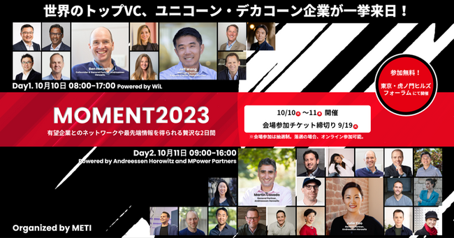 経済産業省は、世界トップレベルのベンチャーキャピタリストを招待し、日本のスタートアップや企業の新事業創出担当者等にグローバルな視座や新たな気づきの機会を提供する場「MOMENT2023」を、10/10(火)・10/11(水)に東京・虎ノ門ヒルズ(フォーラム)にて開催します。
