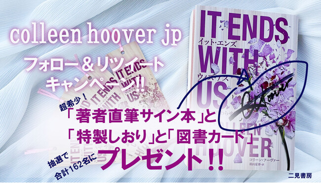 株式会社二見書房(所在地:東京都千代田区、代表取締役社長 堀内誠人)は、世界43か国で発売、全米で発行部数400万部を超える恋愛小説『IT ENDS WITH US』の新装改訂版『イット・エンズ・ウィズ・アス ふたりで終わらせる』の好評を記念して、コリーン・フーヴァーの日本ファンアカウント(@colleenhooverjp)にて「著者直筆サイン本」「図書カード」「オリジナル木製しおり」が抽選で合計162名様に当たるTwitterプレゼントキャンペーンを開催いたします。