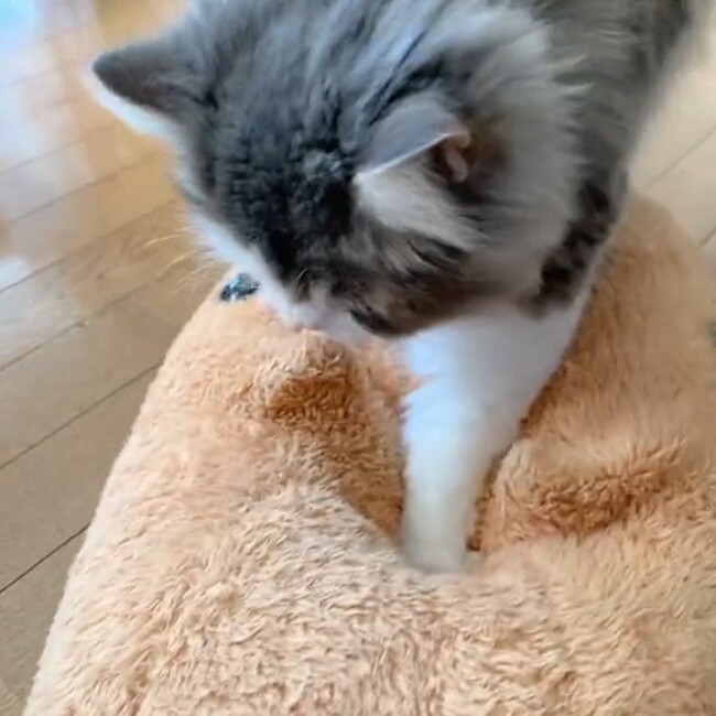 複数の投稿を経て、お気に入りのキャラクタークッションがふみふみを誘発することを発見!