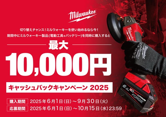 ミルウォーキーツール・ジャパン合同会社(本社:東京都板橋区、ゼネラルマネージャー:林琢磨)は、6月1日(日)~9月30日(火)の期間中、電動工具とバッテリーを同時にご購入いただくと、最大10,000円をキャッシュバック※する「キャッシュバックキャンペーン2025」を実施いたします。