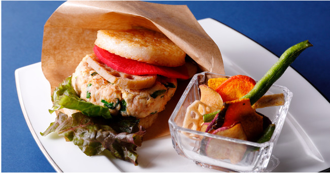 豆腐と鶏胸肉、野菜で作るオリジナルのパテは、吉野葛でとろみをつけた和風ソースを絡め、アクセントに山椒を加えてさっぱり感をプラス。オレンジ風味の大根ピクルス、味付けしたレンコンと共にライスプレートではさみます。また、付け合わせには、いんげんやかぼちゃ、さつまいもなどを低温でフライした彩り豊かな野菜を添え、見た目も鮮やかなプレートに仕上げました。