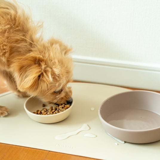 お手入れが簡単なシリコン製のランチョンマット。食べこぼしによる床やカーペットの汚れを防ぎ、マットについた汚れは水で洗い落とせます。シリコン製のため滑り止め効果も高いのでズレを防止することができます。ボウルLをふたつ並べても余裕のあるサイズです。マットをひくことで、おしゃれに演出できます。