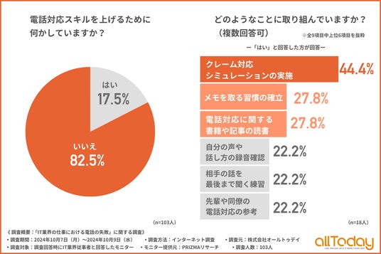 一方で、電話対応スキル向上のために何かしらの取り組みをしている方は約2割にとどまり、多くの方が特別な取り組みをしていないことが判明しました。