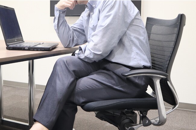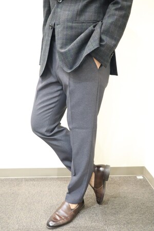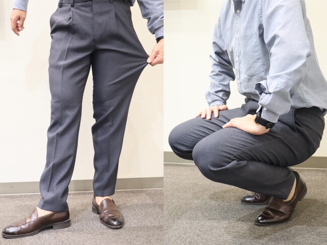 その他、ストレッチ性に優れた生地により、長時間椅子に座っての仕事や自転車などのアクティブな動きでもストレスを感じにくい仕様にしています。また、フロントホックやファスナーを省くことで、従来のスラックスと比べても軽量化が実現した他、自宅の洗濯機で丸洗いができるイージーケア性も兼ね備えた高機能スラックスです。デザインは、ネイビーとグレーの2色を用意し、ワンタック仕様にするなど全体的に少しゆとりを持たせています。