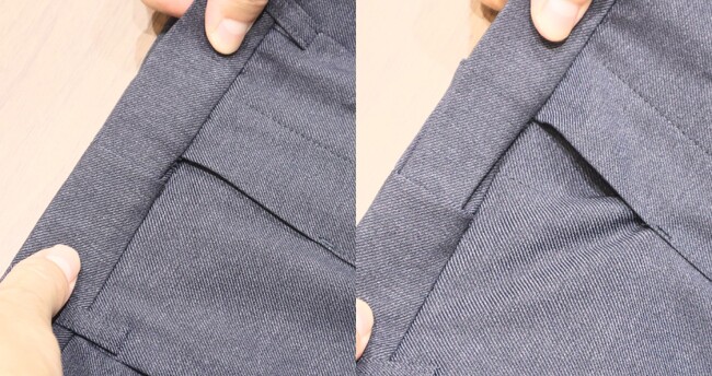 昨今のビジネススタイルの多様化により、カジュアルな装いも選択肢の一つになっています。そのような中で、ビジネスシーンにおいてもスウェットパンツのように、楽で快適な履き心地でありながらも、キレイ目な服装にも合わせやすい“進化系カジュアルパンツ”を企画しました。今回のポイントは、スウェットのような着用感を実現するため、フロントホックやファスナーなどの伸縮性を妨げる付属品を省いてます。フロントの表と裏部分には、スライドして伸びるゴムに加えて、ウエストサイド部分にもシャーリングゴムを取り付けているため、座った時の窮屈感を軽減し快適に着用できます。また、前立て部分を完全に閉じてしまうと伸長率が弱くなるため少し開いているものの、座った時に前立て部分の生地が浮かないように何度も調整を行っており、ビジネスシーンで使いやすいスラックスにするために、フロント部分にダミーでファスナー風の縫い付けを施してます。