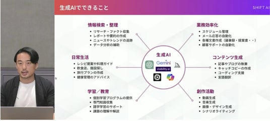 生成AIの活用領域を「情報検索・整理」「業務効率化」「コンテンツ生成」「創作活動」「日常生活」「学習/教育」の6つに分類して、「情報検索やレポート作成から、スケジュール管理、メール応答の自動化まで、幅広い業務で活用が可能になっています」と説明しました。