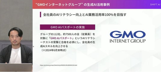 「全社員のAIリテラシー向上とAI業務活用率100%を目指し、グループ112社、約7500人の全従業員を対象に『GMO AIパスポート』という認定制度を実施している」と説明しました。