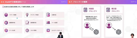 SHIFT AIはビジネス活用を学べるAIコミュニティです。知識0の状態から、最新AIスキルを習得し、AI人材として活躍できるカリキュラムを用意しています。また各方面のAIトップランナーが、国内外の業種やテーマ別のAI活用事例や実践ノウハウをウェビナー形式で講義します。