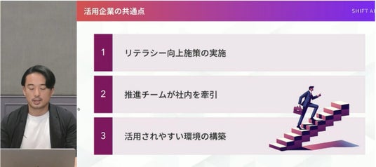 「活用企業に共通する特徴として、リテラシー向上施策の実施、推進チームによる牽引、活用しやすい環境の構築という3つの要素があります」と説明。その上で「生成AIリテラシーは社内全員が持つ必要があり、経営層は戦略への組み込み、リーダーは目標設定と体制構築、メンバーは現場業務での活用という、それぞれの役割に応じたスキル習得が重要です」と強調しました。