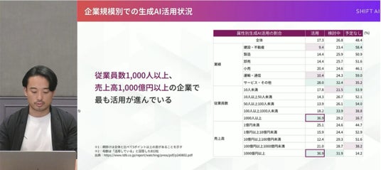 「従業員1,000人以上、売上高1,000億円以上の大企業で生成AIの活用が最も進んでおり、どちらも36.9%の企業が活用している」と現在の日本企業の生成AI活用状況を説明しました。また、「大学生の2人に1人が生成AIをレポート作成等に利用しており、若い世代での活用が進んでおりますが、Fortune 500企業では既に92%が活用しており、日本は海外と比べて遅れています」と話しました。