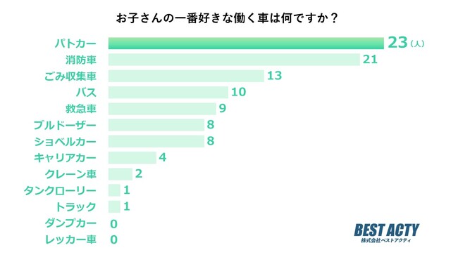 アウトドアメディア「TACKLE NOTE(https://tacklenote.com/columns/)」を運営する株式会社ベストアクティ(https://tacklenote.com)は、10代から60代までの100人に【子どもが一番好きな働く車】についてアンケートを行いました。